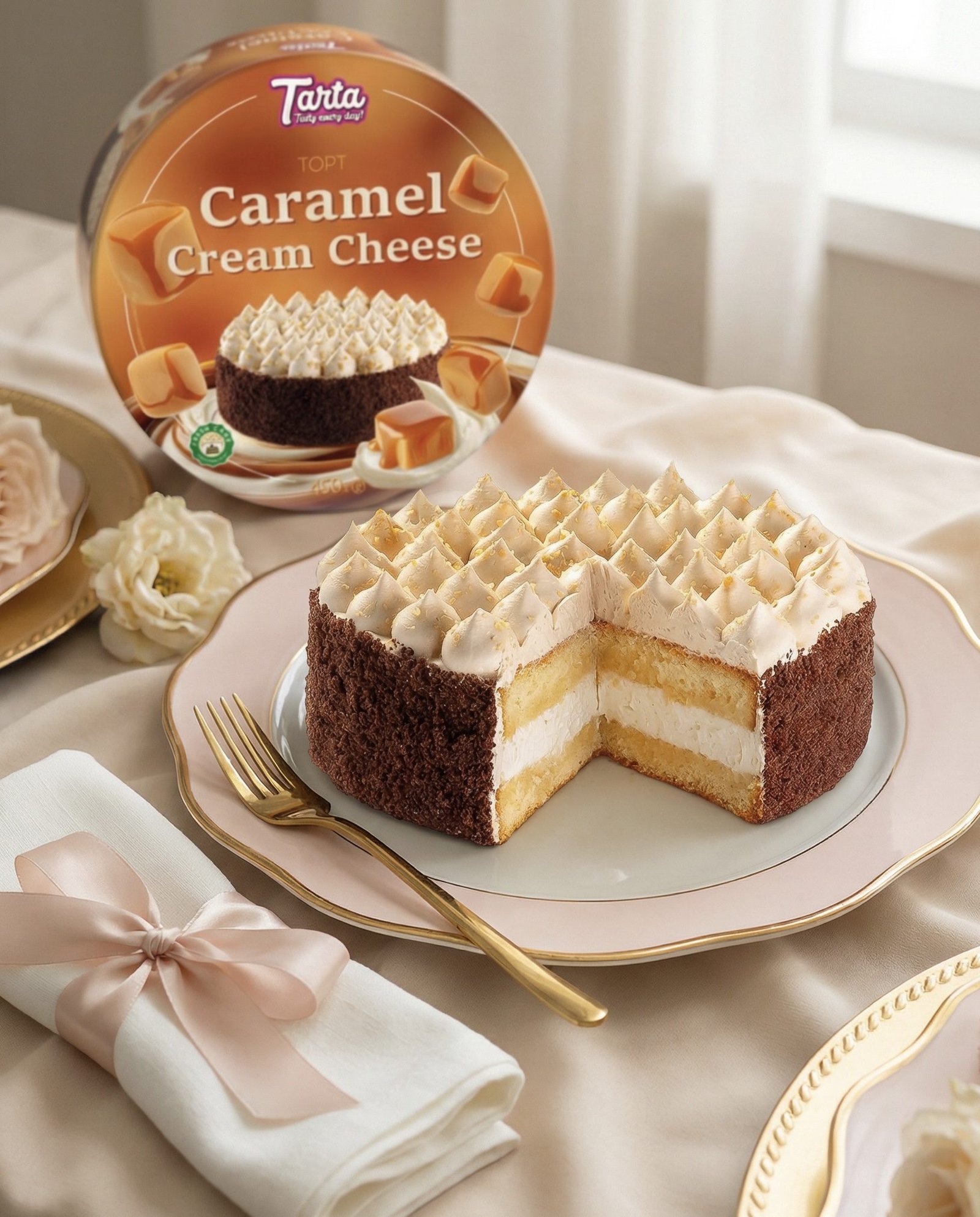 The cake combines airy sponge layers with a delicate caramel cream, creating a rich yet soft flavor.