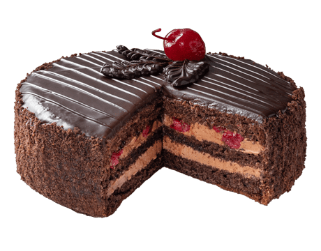 Cake "Prague" with Cherry - the familiar cocoa flavor of the 'Prague' cake, complemented by the sweet and tart taste of simmered cherries. The sponge cakes are soaked in cherry syrup."